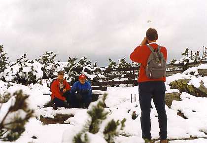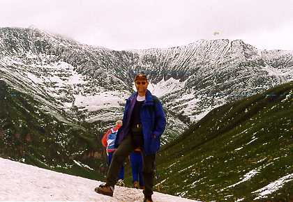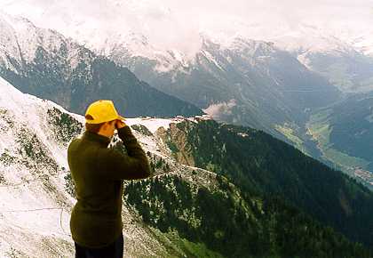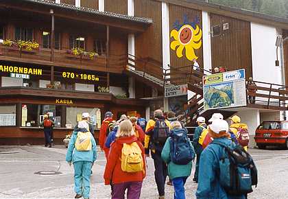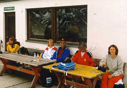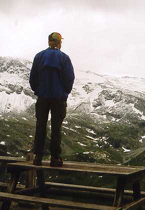 Dag 5: Onsdag 8/7 1998 kl. 15:30I morse var det åter dåligt väder med regn. Efter frukost var det dags för alla att samlas vid bussen för avfärd. Vi var alla ordentligt klädda, då det regnade och uppe på 2000m var det nollgradigt. Vid Hintertuxglaciären var det -8 grader och snöfall.Vi åkte med vår buss förbi Ramsau och upp till Hainzenberg. Därifrån tog vi kabinbanan upp till Gerlosstein (c:a 1600 möh). Där var det inte många plusgrader och dimman låg tät över topparna. |
