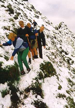 på en mycket smal och tämligen farlig stig med branter både uppåt och nedåt.
