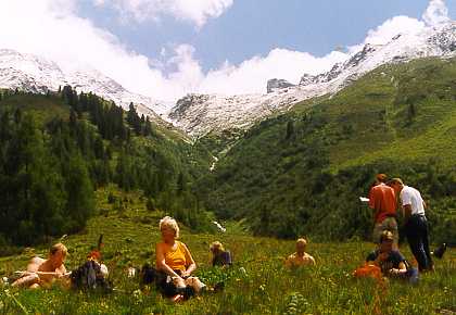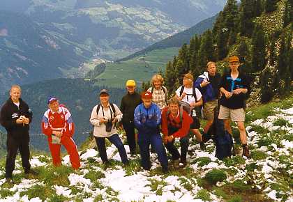 Dag 7: Fredag 10/7 1998 kl. 21:30I dag var sista dagen på vår vandringsresa och jag tror att alla har varit riktigt nöjda med denna dag. En del tyckte att det var den bästa dagen. Vädret i morse var rätt bra med delvis sol.Efter frukost och köp av lunch samlades vi vid vår buss för att åka till Hintertux (1493 möh). Det är en ort längst upp i dalgången. Därifrån tog vi kabinbanan upp till Sommerbergalm (1986 möh). |
