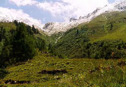 Därefter öppnades dalen till en bred och grönskande äng. Det var brant ned till dalen och de flesta tog en paus där nere. Det hade hela tiden varit kalt, men vi kom sedan ner till trädgränsen och vi gick sista biten mot Hintertux i skogsterräng. |