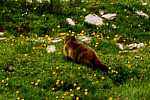 Vi som ätit lunch gick sedan nedåt utefter en annan grusväg, som skulle leda oss ända ned till Hintertux. På väg utför såg vi efter en stund flera murmeldjur, som verkar vara en större variant av våra fjällämlar. Jag lyckades få ett bra kort på en av dom. |