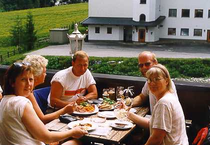 16:30 vandrade vi tre mot hotellet och var mycket nöjda med vad vi upplevt denna dag. Vi fick sedan middag 18:00, då de flesta skulle åka på en Tyrolerafton. Vi var dock c:a 10 st. kvar, som senare på kvällen hade en egen Tyrolerafton utanför hotellet, där det var musik av en lokal grupp. Hotellägaren bjöd oss på en snaps och stämningen var hög i gruppen med samtal om dagens händelser. |