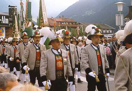 | Vi åkte sedan tillbaka med bussen till Mayrhofen. Vi samlades sedan 18:30 för vår sista gemensamma middag. Samtidigt såg vi att folk klädda i folkdräkter hade samlats i stor mängd utefter gatan från vårt hotell och bakåt. Det skulle bli en parad, som startade 19:00. |