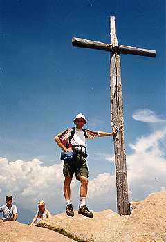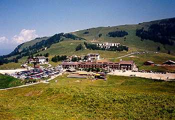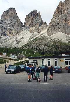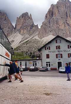 Dag 7: Torsdag 8/7 1999 kl. 12:00I går kväll efter middagen åkte en del in till S:t Ulrich för en pubrunda medan några av oss andra stannade kvar på hotellet.I morse före frukosten köpte jag som vanligt bröd med ost och skinka vid det lokala bageriet. Kl. 09.00 åkte vi iväg med bussen förbi Wolkenstein och upp i bergsmassivet Sassolungo till Sellajoch. |