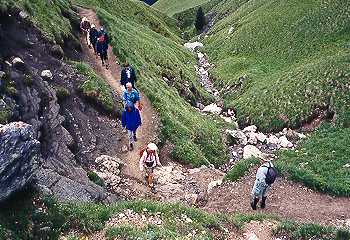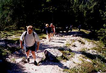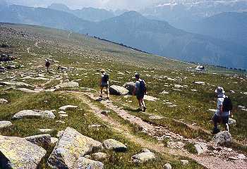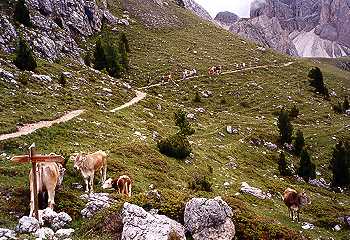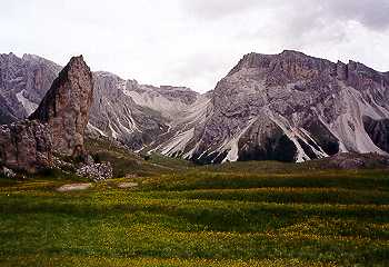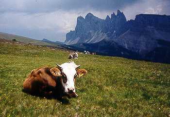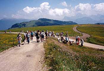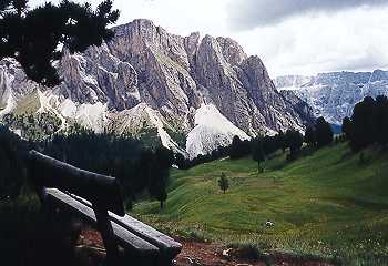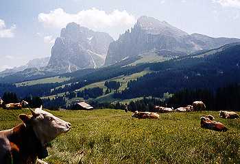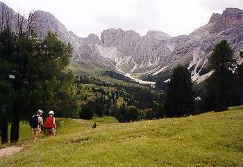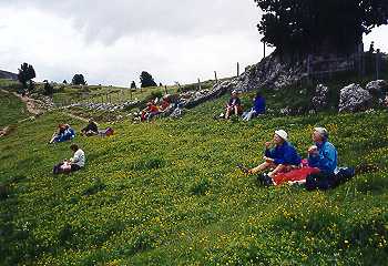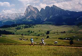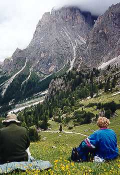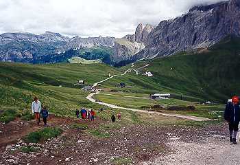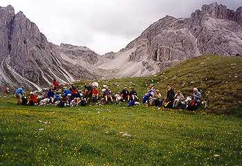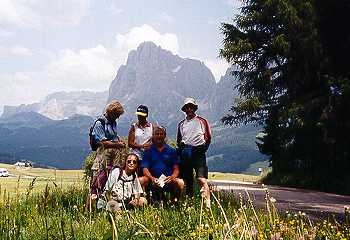 Dag 6: Onsdag 7/7 1999 kl. 17:30En del av oss fortsatte i morse vandringen upp mot Seceda medan andra vek av ner mot Troier Hütte. |