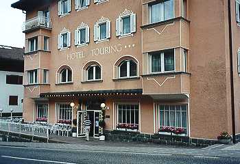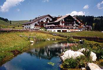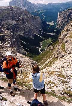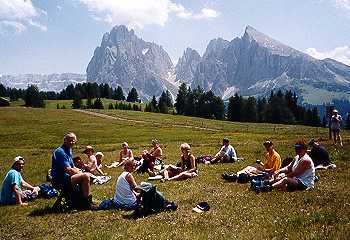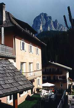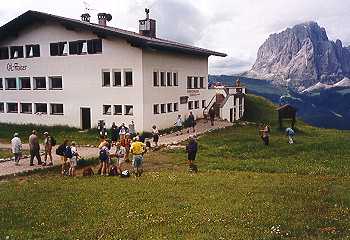Dag 3: Söndag 4/7 1999 kl. 11:30Vi har nu åkt en lång linbana på 20 minuter från Ortesei/S:t Ulrich och rakt upp i bergen.I går kväll kom bussen så småningom tillbaka från Mayrhofen och vi åkte vidare förbi Innsbruck och in i Italien. Över passet fick bussen problem med motorvärmen men chauffören gjorde en strong insats med hjälp av direktkontakt med teknikern hemma i Sverige, så han kunde åtgärda problemet. I sådana lägen är det oumbärligt med telefon. Det hela gjorde dock att vi blev försenade och vi åkte in i Val Gardena- dalen i mörker och såg inget av omgivningarna. Det var dock en smal och krokig väg upp i dalen. Vi fick sedan snabbt våra rum och en sen middag. I morse var det lika fint väder och vi kunde se hela dalen och topparna runt om. Man blir särskilt imponerad av Sassolungo som sträcker sig rakt upp i skyn. Den är som en gotländsk rauk men 100 gånger större. |