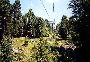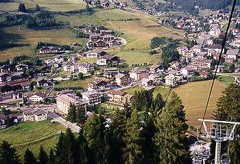Jag fyllde även på en halv liter flaska med vatten, som jag hade i ryggsäcken, samt en vattenflaska, som jag har i ett höftbälte. Denna flaska gör att jag enkelt kan ta en klunk vatten under vandringen. Vi lämnade sedan vårt hotel med bussen kl 09.00 och åkte ner till Ortesei eller S:t Ulrich på tyska. Där parkerade vi bussen vid vägen och gick upp till centrum. Det var mycket folk i farten, då det var en särskild fest denna dag. Medan vår reseledare gick och köpte biljetter till liften (15000 lire/person) och kartor över Val Gardena (5000 lire/st) gick vi andra och letade upp en butik med bröd. Det var först inte så lätt att hitta, då det var söndag och stängt, men på ett café fanns även bröd att köpa. Sedan åkte vi stolslift i 20 min. Upp till Rasciesa på 2100 meter höjd. |