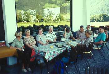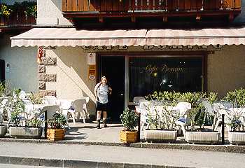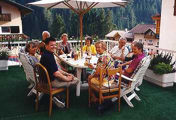 Dag 2: Lördag 3/7 1999 kl. 19:00Nu sitter vi vid en uteservering längst ner i Zillerdalen och dricker en öl. Bussen skall upp till Mayrhofen och lämna av ett antal resenärer, så vi som skall till Val Gardena passar på att ta en paus i värmen.Detta gör vi på ett vällovligt initiativ från Per-Arne Andé Roslagsbostäder AB i Norrtälje, där du kan hyra en trivsam och prisvärd bostad (se www.roslagsbo.se). Han får lite reklam som tack för förslaget. |