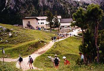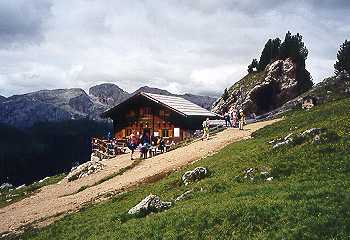 | Några av oss gick tillsammans med några från Örebro-gänget, som bor i Wolkenstein, uppåt på väg 4 från Langental och sedan utefter Dolomiten Höhenweg. | Det var mycket brant och jobbigt att gå uppför med en fantastisk utsikt ner i dalen. Kl 11.45 var vi sedan framme här i Püez Hütte, här vi stannar och fikar. |
