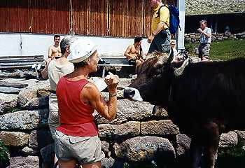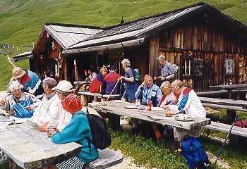 Dag 8: Fredag 9/7 1999 kl. 18:30Efter att ha fikat färdigt i Püez Hütte fortsatte de första av oss att vandra vidare kl. 12.20. |