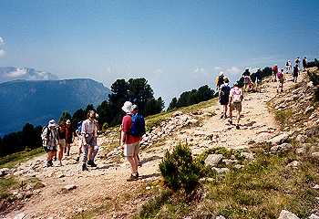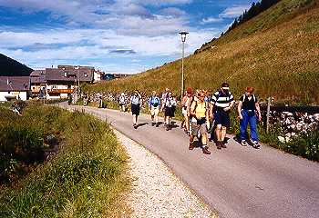 Dag 5: Tisdag 6/7 1999 kl. 09:00Nu sitter vi i bussen och åker på motorvägen på väg mot Gardasjön. Vi har en vilodag, som vi tillbringar med en busstur, vilken kostar 200:-/person inkl. båttur.I går fortsatte vi vandringen efter hotell Sonne uppför backen mot Seilbahn på 2000 meters höjd. Enligt den ursprungliga planen skulle vi ha åkt denna kabinbana från S:t Ulrich men den var nu stängd och det blev i stället en busstur till Compatsch. |