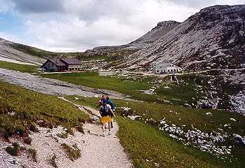| Där vandringen runt Sassolungo började var det först en brant och bred väg 594 upp till August Hütte. Därefter en lättgången stig parallellt med branten. | Det är mycket folk som går här och man undrar om alla skall gå runt Sassolungo, men troligen vänder de flesta vid den Hütte, där jag nu sitter, vilket är Sasso Piatto Hütte. Härifrån fortsätter vandringen på väg 527 till Piza da Uridl. |