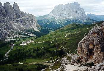 Så småningom gick stigen utför och vi såg Grödner Joch nere i dalen. |