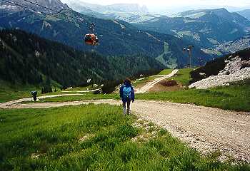 | Vädret hade nu åter blivit varmare. Vi gick nu inte i samlad trupp utan var och en kunde gå tillbaka när det passade, då vi skulle åka linbanan ner till S:t Christina utan att passa någon busstid. | Några av oss gick ner 13.30 från Troier Hütte och var tillbaka en knapp timme senare vid linbanan och tillbaka till hotellet 15.00. |
