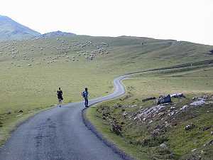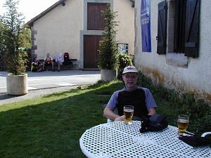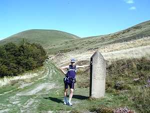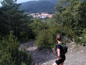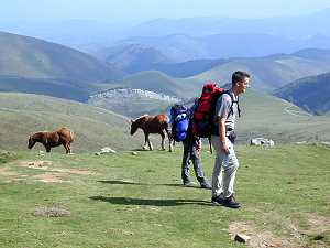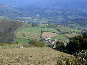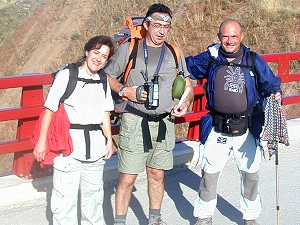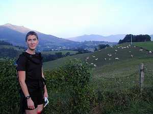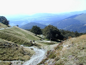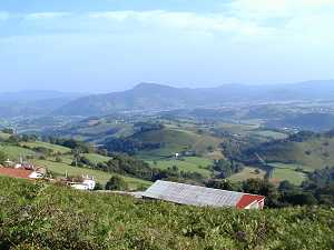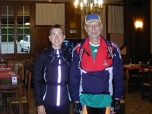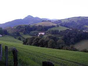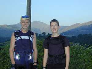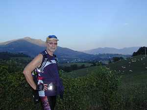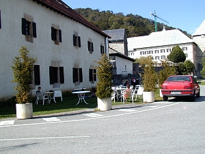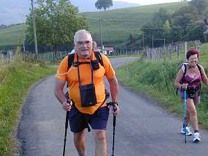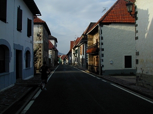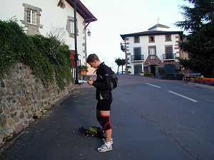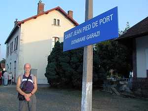 Dag 2: Söndag 16/9 2007 kl. 17.30Vi kom fram i går med tåget till Bayonne 17.45 och en halv timme senare gick ett mindre tåg upp i bergen. Det var ibland branta berg runt om och djupa dalgångar men när vi kom fram till Jean de Pied de Port var det en platt dalgång. Klockan var 19.30 och solen höll på att gå ned. Som tur var så var det fortfarande ljust och lättare att hitta då.Vi gick genom hela samhället på 15-20 min och hittade så småningom hotellet. Middag serverades från kl 20, men vi gick först upp på rummet och duschade och bytte om. Det var väl ingen bra kvalitet på rummet precis med saker som var sönder, men det fick duga. Vi gick ner och serverades en god 3-rätters middag, som smakade bra. Bredvid oss satt faktiskt ett annat svenskt par, som skulle gå samma som vi men ytterligare en vecka. Vi hade mycket trevligt samtal med dom och utbytte erfarenheter. Vi hade ställt klockan på 7.00 då frukost var 07.30. Då var det fortfarande mörkt ute. Till frukost fick man en klassisk fransk frukost, d.v.s. croissant och painriche med en kopp te. Inte mycket att stoppa i magen, då man ska springa 26 km. Vi smörjde in oss noggrant med solkräm och bar sedan ner våra väskor, som skulle hämtas för transport till nästa hotell. En kvart före 9 var vi klara att ge oss av. Det andra paret hade redan gått iväg via den enklare leden. Vi hade också bestämt oss för att springa denna. Det var dock inte lätt att hitta rätt ut ur samhället trots karta och bok. Vi hade fått en engelsk bok med detaljerad beskrivning av hela leden men det var inte mycket som stämde i början. Vi stötte på flera andra vandrare mest fransmän, som inte kunde engelska. Vi pratade med många och kom i väg rätt brant uppför på en liten asfaltväg. Här kunde man se det märke ett gult snäckskal, som finns hela vägen. Någonstans delade sig dock vägen eller så kom vi i väg fel i början, för det visade sig att vi hade kommit iväg på fel väg och kom in på den branta leden över bergen. Vi beslöt då att fortsätta där, för det var så vackert och för långt att vända om. Men det är ändå lite irriterande att inte ha exakt beskrivning, så man vet var man är. Många andra med andra kartor visste inte riktigt heller hur det var. Det där förföljde oss under en stor del av dagen, där man inte riktigt visste hur långt man kommit. Uppefter denna led skulle finnas ett bed and breakfast i Honto, men det såg vi aldrig till. Efter ett tag skulle man avvika från vägen och gå en stig hela tiden brant uppåt. |