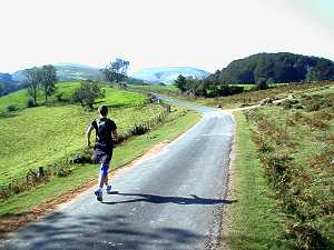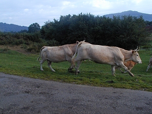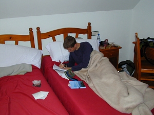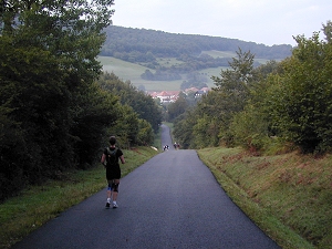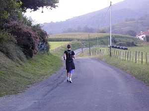 Dag 3: Måndag 17/9 2007 kl. 17.00Vi fick i går en god 3-rätters middag bestående av salladstallrik, fläskkött och pommes frites samt glass. Till detta delade vi på en flaska vin och jag drack en kopp kaffe. Här nere är det inte standard med kaffe på maten, så det måste man beställa speciellt. I morse hade vi ställt klockan på 7.30, då frukosten var kl. 08.30. Under natten hade det åskat och regnat en hel del, så jag funderade på om man skulle ta med ett paraply, men det hade klarnat upp och solen var på gång, så den fick vara kvar. Vi blandade ihop var sin stor påse med russin och nötter, som är en mycket bra och energirik föda under joggingen. Dessutom fyllde vi på vatten ur kranen till flaskorna. Vi har inte haft några problem än så länge med kranvattnet på hotellen. Sedan gick vi ner och år frukost och här var det en bättre frukost än dagen före med lite allt möjligt. När vi var uppe på rummet igen och packade väskorna kom en kille, som skulle köra vårt bagage emellan hotellen under hela veckan. Dessa kördes nu direkt till Zubiri. Vi var klara kl. 9.15 och gick i väg på stigen till höger om vägen till Compostella, Det var en mycket fin stig c:a 1 meter bred och grusad under träd. Efter 3 km var vi framme vid Burguete. Här sprang vi ett tag på asfaltväg. Mitt inne i samhället träffade vi på det andra svenska paret, som hade bott på ett annat hotell i Roncesvalles. Här avvek leden från vägen och vi gick mindre vägar/stigar ut på landet. Det var även springvänligt, så vi kunde springa en hel del enligt våra planer. Hela vägen är det bra skyltat av spanjorerna, ofta med en cementstod och det väl synliga blågula snäckmärket. Ibland kan man även se ett rött och ett vitt streck och det kan även vara gula pilar. Efter en timme och 7 km. var vi vid Espinol. Här fanns en vattenkälla, så vi kunde fylla på vatten i flaskorna, men jag hade inte druckit så mycket då. Vi joggade vidare och passerade många vandrare, som startat tidigt från vandrarhemmet i Rocesvalles. Det var rätt stort och nästan 200 personer hade sovit i den stora sovsalen. |