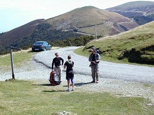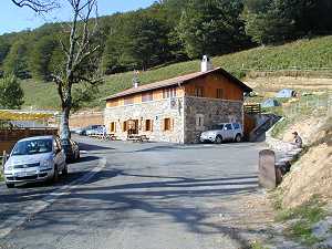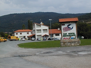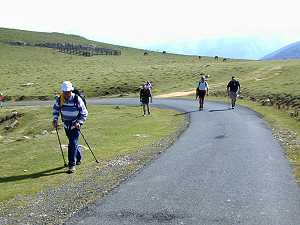 När vi gått en bit på stigen kom den åter ut på en bilväg och det var bara att fortsätta uppåt. Efter bara c:a 50m såg Sandra en vattenkran på en stolpe, vilken såg ny ut. Här kunde vi tacksamt fylla på våra flaskor, som var tomma på vatten efter den branta stigningen. Solen sken och det var en fantastisk utsikt och underbar natur, så vi ångrade inte att vi råkade ta denna led. Efter ytterligare vandring stannade vi för att äta russin/nötter och dricka vatten. Det behövdes energi, då vi gått så mycket uppför. Det gick inte att springa något, då det var så brant. När vi sedan fortsatte runt krönet uppenbarade sig här uppe dagens guldgruva. Det var en krog med servering och övernattning. Mycket bra läge på denna och bra om man kände till den. Trots att vi nyss ätit så beställde vi juice och mackor. Det smakade bra och sedan gick vi mätta vidare. Det var många vandrare, som var på väg nu. Ibland planade det ut lite, så vi kunde springa. Så småningom gick vi av bilvägen och upp på en grässtig uppåt vid Croix Thibaut, där det var ett kors i sten. En bit upp på kullen tog vi paus bland hästar och får. Senare kom vi fram till spanska gränsen, där det var ett nytt ställe för att fylla på vatten. Här hade många vandrare stannat och det blev kö till vattenkranen. På den spanska sidan var markeringen av leden bättre med nya skyltar med det gula snäckskalet på blå botten. Fransmännen borde skärpa till sin skyltning på den franska sidan. Leden gick nu lite upp och ner och på något ställe lite geggigt, men det gick att ta sig fram. Sedan gick leden uppåt igen till dagens högsta punkt på drygt 1400 möh. Här var det en härlig utsikt neråt dalen mot Roncesvalles, dit vi skulle. Det var nu endast 4 km. kvar. Det var mycket brant utför och redan efter en halv timme var vi framme kl. 14.20. Det hade tagit c:a 5 och en halv timme. Vi kom fram till några stora byggander, som var hotell, vandrarhem, kyrka, kloster och restaurang. Det var här fullt med folk kanske för att det var söndag. Bagaget var redan här och vi fick nyckel till rummet. Vi har sedan duschat och bytt om och varit och druckit en öl utomhus och sett alla vandrare, som kommit. På hotellet fanns det tillgång till internet så vi kunde kolla vädret för de närmaste dagarna. Det kostade 1 euro för 18 min. Nu ligger vi och vilar och inväntar middagen kl. 20.30. Det känns bra i kroppen trots 26 km. jogging och vandring. |
