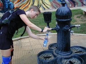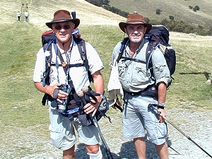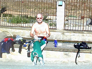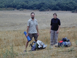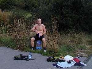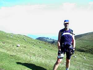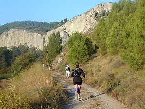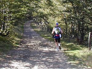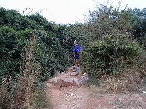 Vi har då enbart kortare joggingdress, vätskebälte och speciell springryggsäck på oss. I den finns de viktigaste papperen, pass och pengar samt nära 1 liter vatten och påse med russin/nötter. Dessutom har jag mobil, kamera, skavsårsplåster och en bok med beskrivning av leden. Jag har dessutom ett vätskebälte runt midjan med 5 flaskor, som tillsammans rymmer 1 liter vatten.