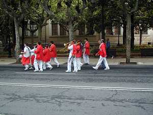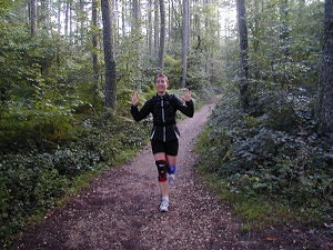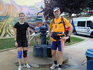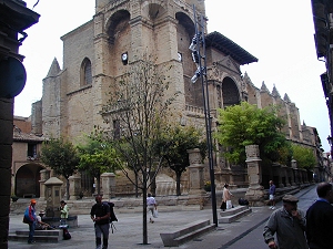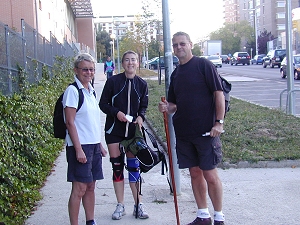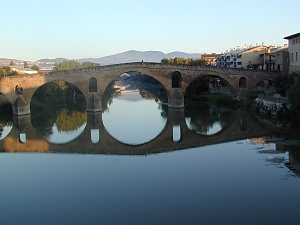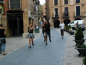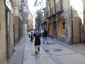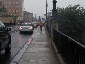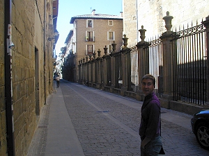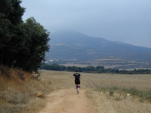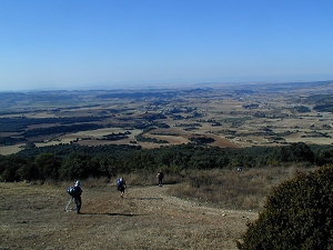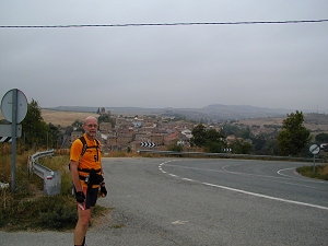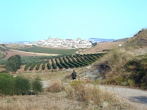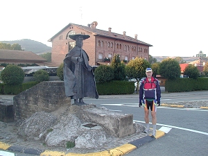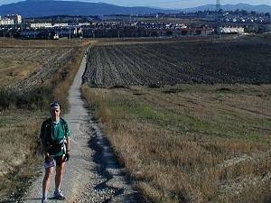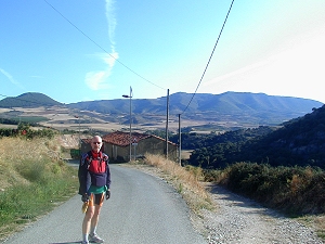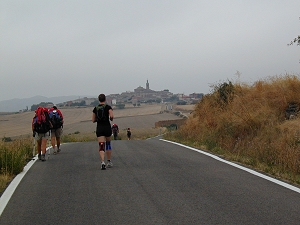 Dag 5: Onsdag 19/9 2007 kl. 17.00I går hade Sandra hittat några käglor för jonglering på sin shoppingrunda. Sedan gick vi till ett stort torg, som vi hade sett tidigare. Där var mycket folk och även musik. Vi gick runt och letade restaurang. Det fanns många men de var oftast bara en bar och sedan skulle man sitta utanför äta. Då vi tyckte det var kallt, gick vi in i den enda med stor matsal. Där satt redan de fyra kvinnor från Stockholm, som vi hade mött tidigare. Vi beställde in en 3-rätters middag på pasta, kött, pommes frites samt en kaka efteråt. Man blev då ordentligt mätt. I morse hade vi som vanligt klockan på 7.00, då frukost var en halvtimme senare. Frukosten bestod här av både bröd, yoghurt och lite annat. KL. 8.40 var vi klara och gav oss i väg. Det var helt klart och bara 8 grader medan solen var på väg upp. Vi sprang först någon km genom Pamplona, innan vi kom ut på landet. Vi passerade byn Cizur Menor efter några km . |