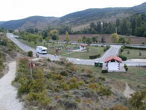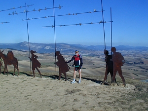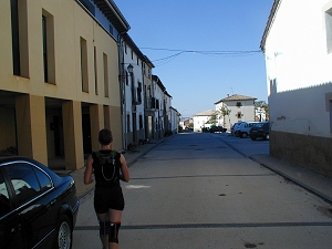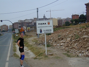 Dag 8: Lördag 22/9 2007 kl. 18.20Det var lite svårt i går kväll att välja middag, då meny var ett handskrivet papper på spanska. Men det löste sig då värdinnan tog oss in i köket, där vi valde bland grytorna. Det blev en soppa på kikärter först samt goda köttbullar i en sås som vanligt med pommes frites och en kaka efteråt. Vi fick husets vin från en jättestor tunna.Denna natt sov jag som vanligt och inte enbart 4 timmar bl.a. för vi hade fönstret öppet. Vi klädde direkt på oss springdressen och packade väskorna och tog dom till våning 1. Hotellet var helt tyst så vi lämnade rumsnyckeln i dörren. Sedan letade vi upp puben i närheten, där vi fick vår frukost, som bestod av en kopp te, en liten baguette och ett glas juice. Det var inte mycket denna gång. Vi kom iväg strax efter kl. 8. Det var helmulet lite dis men rätt varmt, så vi hade enbart T-shirt på. Vi tog det lugnt i början, då vi hade 28 km att springa. Efter 6 km kom vi fram till Sansol, 500 m.ö.h. så vi springer hela tiden på en högplatå med öppen fin natur. Det är lättsprungen bred grusväg blandat ibland med smalare stigar. En km senare var vi framme vid byn Torres del Rio. Men sedan var det 11 km utan några samhällen fram till Viana. Det var varmt så det gick mycket vatten men i Viana fanns vattenkranar på två ställen, så vi kunde fylla på flaskorna. Som vanligt sprang vi om många som både var okända men även nu många bekanta. |
