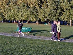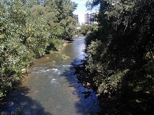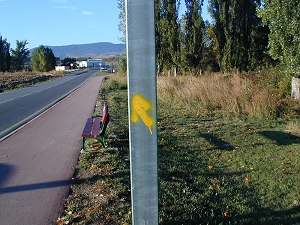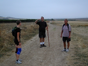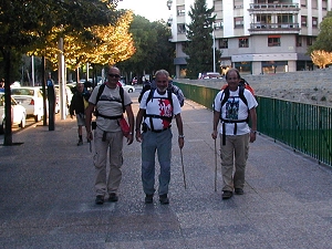 Dag 4: Tisdag 18/9 2007 kl. 17.00När vi skulle äta middag så satt redan Sten och Lillemor (det svenska paret) vid baren och drack en öl före middagen. Vi blev bjudna på var sin och gjorde sällskap en stund. Sedan skulle dom duscha och byta om då dom nu hade hämtat bagaget på det andra hotellet. Vi gick in i matsalen och åt paella, kalvfilé med pommes frites och glass. Sedan känner man sig ordentligt mätt ett tag. Ett antal andra vandrare satt också där och åt middag. Annars var väl de flesta vandrarna i vandrarhemmet inne i samhället. I morse hade dom frukost redan från kl. 7, men vi gick dit en halvtimme senare. Personalen här var nog de mest personliga vi mött hittills och vi blev t.o.m. bjudna på det vi drack till middagen dagen före. Ute var det rätt dåligt väder, nästan regn och 10-15 grader. Vi kom iväg 8.40 och joggade genom samhället och sedan söderut. Efter en halvtimme var vi varma och tog av jackorna. För min del hade jag i dag inte linne utan en T-shirt, då jag hade fått rött skavsår i huden under armhålan där armen nötte mot insidan av kroppen. Det mesta var dock läkt av att jag lagt på Aloe Vera, som är bra mot rodnader och brännsår. Sedan kunde vi jogga mest hela tiden, då det var rätt plant och bra stig/väg att springa på. Många vandrare hade börjat före oss särskilt från vandrarhemmet. Vi började känna igen en del bl.a. två franska bröder samt 4 kvinnor från Stockholm. De skulle gå till Pamplona och sedan åka hem. Här gick leden utefter floden Arga. Efter några km. var det en vattenkran, men jag fyllde bara på en liten flaska, då jag inte hade druckit så mycket vatten. När vi stannade till blev vi nästan frusna, då det var rätt svalt. Vi hade nu även fått rätt kraftig träningsvärk efter de två första dagarna, så efter en paus var det stelt i kroppen. Jag skulle tro att träningsvärken sitter i någon dag till och sedan blir vi starkare för varje dag. |