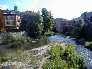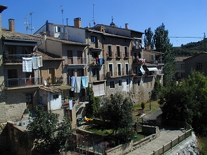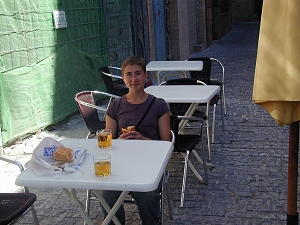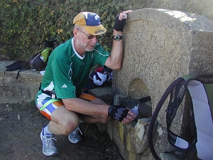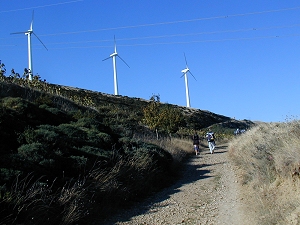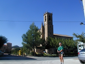 Man kunde även se flera vindkraftverk på andra berg. Det var en pampig syn, så här har spanjorerna kommit långt med denna utbyggnad. Strax före kunde vi även fylla på våra flaskor med vatten. Solen sken men det var en kall frisk nordlig vind här uppe, så vi hade tagit på jackorna igen. Sedan gick leden på besvärlig kullersten utför i någon km innan det planade ut. Vi tog där nere paus för att äta russin/nötter och dricka vatten och vila en stund. Sedan sprang vi vidare genom byarna Uterga, där det också fanns vatten, samt genom Muruzabal och Obanos där det fanns vandrarhem med restaurang i slutet av byn. Vi var sedan framme här i Puente la Reina kl. 12. Det tog då 3.20 timmar att springa de c:a 24 km. Vi hade tur denna gång, då väskorna just hade kommit hit. Vi gick upp på rummet och tvättade upp smutsiga kläder och hoppas att dom hinner torka till i morgon. Sedan efter en dusch och bad för Sandra tog vi först var sin stor öl med smörgås och gick sedan ut på byn. Solen sken och det var nu 24 grader, fast det kändes svalt i skuggan. Nu ligger vi och vilar inför middagen. |