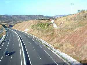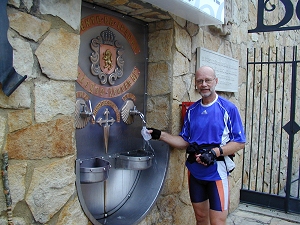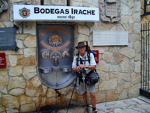 Dag 7: Fredag 21/9 2007 kl. 18.15I går kväll var det middag så sent som 20.30. Man hinner knappt smälta maten tyvärr innan man ska lägga sig, men så är matkulturen här. Det var något kallt i matsalen, så det behövdes nästan jacka på. Vi hade nog ätit lite väl mycket godis, så det var svårt med all mat. Jag åt äggröra med svamp, goda kycklingbröst även denna gång med pommes frites (finns det inget annat till?) samt ostkaka till efterrätt. Vi hade även nu trevligt sällskap av Sten och Lillemor vid middagen. Sedan gick vi upp och lades oss direkt för att sova. Jag fick problem med sömnen denna natt, så det blev bara c:a 4 timmars sömn. Men det blir väl bättre i natt, får jag hoppas. I morse klev vi upp kl. 7 och hade frukost vid 7.30. Sedan hade vi packat och kom iväg en bit efter kl. 8. Det var nu mulet men varmare. Man hade pratat om regn i dag, så det skulle i så fall bli första regnet för oss. Vi gick genom Estella och kom ut på leden igen kl. 8.30. Vi hade vindjackor på, men regnet ville inte komma trots att det var dimmigt och svart runt om i bergen. Det var varmt, så jackorna åkte snart av. Jag hade haft en plastpåse runt kameran, men tog av den. Kameraremmen hänger runt halsen och är fastspänd på magen med bältet från ryggsäcken, vilket fungerar bra så att kameran inte slänger när man springer. Efter några km var vi vid den berömda vintanken i Ayegui vid klostret Irache. Där skulle finnas en kran med vatten och en annan med vin. Vattnet fanns men tyvärr kunde man bara få fram droppar med vin. Den tanken var ej fylld. Här träffade vi åter på de två bröderna med filmkameran. Sedan fortsatte vi på leden mot Azqueta. Leden var rätt bra att springa på och det var flera vattenkranar, så vattnet var alltid påfyllt. Vi sprang åter förbi ett par, som var från Estland och Sydafrika. Så det är många olika nationaliteter, men de flesta är nog spanjorer. |