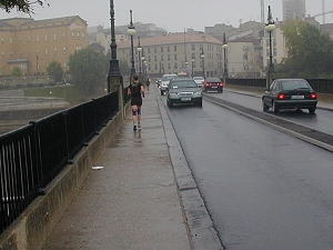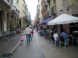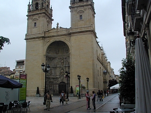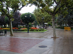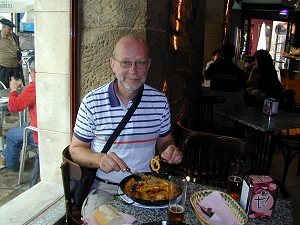 Nu var det 9 km kvar till slutmålet och det började bli fuktigt. Några km senare kom duggregn och sista kilometrarna på asfalt blev helt i regn. Vi sprang över floden Ebro och var framme i Logrono kl 11.50, så de 28 km tog 3.45 att springa. Med kartan letade vi upp hotellet, som var det finaste vi haft under hela veckan, riktigt lyxigt. Bagaget hade även nu inte kommit. Vi gick upp och duschade och vilade och halvsov en stund. Kl. 14.30 hade väskorna inte kommit, så vi gick ut med våra blöta springkläder till järnvägsstationen för att köpa biljetter till Bilbao. Det var tack vare Sandra, som vi gjorde det och det var bra för det gick inga tåg som passade. Vi skulle nämligen åka buss och mannen i kassan kunde ingen engelska alls. Det är en stor nackdel att nästan ingen här kan engelska inte ens ungdomarna. Vi lyckades hitta busstationen, där vi tittade runt en hel del och till slut kunde vi köpa bussbiljetter för i morgon till Bilbao av en kvinna, som kunde en aning engelska. När vi kom tillbaka till hotellet hade väskorna kommit och vi kunde byta till torra kläder. Sedan gick vi ut på stan. Logrono är rätt stor med 120000 invånare och det var mycket folk ute på lördag eftermiddag. Vi hittade en restaurang, där Sandra bjöd mig på födelsedagsmiddag, då jag fyller 61 nästa vecka. Det blev en stor panna paella för oss var. Det var riktigt gott och vi blev helt mätta. Sedan gick vi runt lite och vilar nu på hotellet. |
