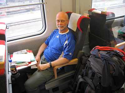 Dag 1: Onsdag 12/8 2009 kl. 18:30Nu är jag på väg i tåget och har fått en ensam plats i en nybyggd vagn. Det är bara c:a 10 st. i vagnen men kanske det kliver på fler senare.Konduktören var snäll och tog ett kort på mig med min nya ultrakompakta kamera, som jag kan ha fast på livremmen, mycket praktiskt. |