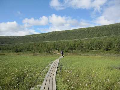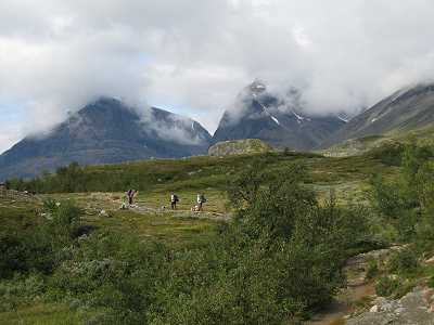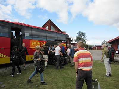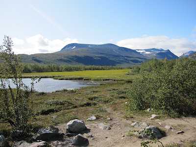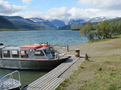 Dag 2: Torsdag 13/8 2009 kl. 11:30Nu är jag framme i Nikkaluokta. Tåget blev försenat nästan en halv timme av signalfel, men bussen väntade på oss. Vi blev drygt halvfull buss, så det är färre som vandrar nu i mitten av augusti. Vädret är lite växlande men inget regn på gång.Båten över Laddjujavri går kl. 14, så jag har gott om tid då det tar knappt 1,5 timmar att gå dir. Sedan efter en halv timmes båtfärd tar det c:a 2,5 timmar att gå upp till fjällstationen. |