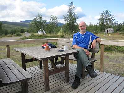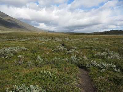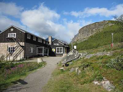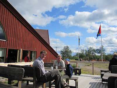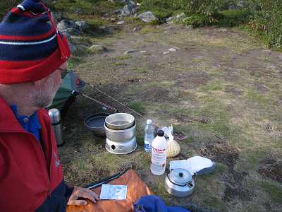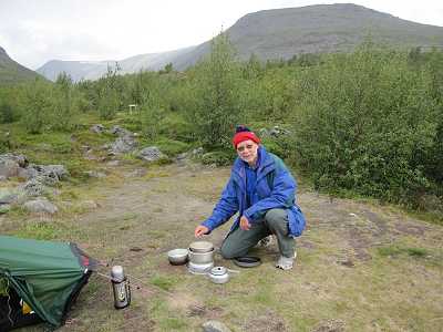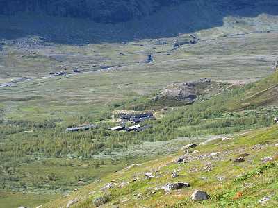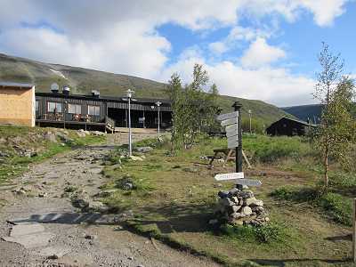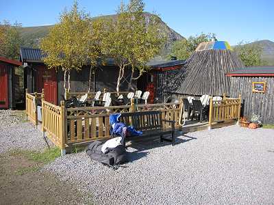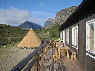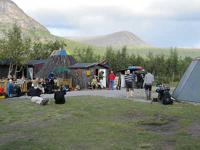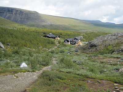 Dag 4: Lördag 15/8 2009 kl. 17:30Nu skiner solen och det känns riktigt skönt. Den torkade lövbiffen ligger i blötläggning för att kokas. Tur föresten att jag har en hel del torkad mat med mig för sånt finns knappt att köpa här.Jag gick bort vid 2-tiden till fjällstationen och fikade på kaffe och bulle. Ute var det då halvmulet och bara 10 grader, så det satt rätt många inne och pratade. Man får en känsla av att en del är här inte för att vandra utan för att slappna av i fjällmiljö. Efteråt gick jag till butiken på fjällstationen för att köpa russin och se vad dom i övrigt hade. Men det fanns inga russin och inte heller vanlig frystorkad mat. Man hade haft det men hade numera en norsk leverantör med lång leveranstid, så det verkade inte komma in något nytt. |