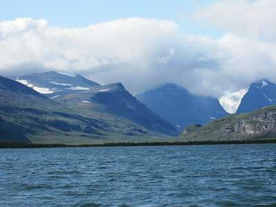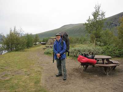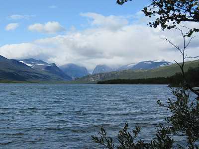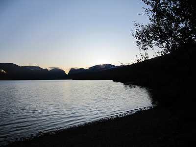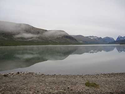 Dag 8: Onsdag 19/8 2009 kl. 19:00Jag sitter nu i kvällssolen lutad mot en lappkåta vid Laddjujavris nedre båtlänning, alltså vid sjöns östra sida och har 6 km kvar till Nikkaluokta.Jag kom iväg i morse strax efter kl. 11 och det var nära att en regnskur kom över mig, men den gick nere i dalgången i stället. Det var en kall västlig vind och rätt så klart, men snabba regnmoln kunde komma från fjällmassivet. Det gick fort att vandra utför och jag var nere vid Laddjujavris övre båtlänning redan vid 13-tiden. Då hade båten just gått, men det gjorde inget för mig då jag bestämt mig för att gå runt sjön. |
