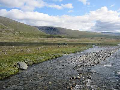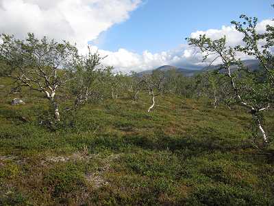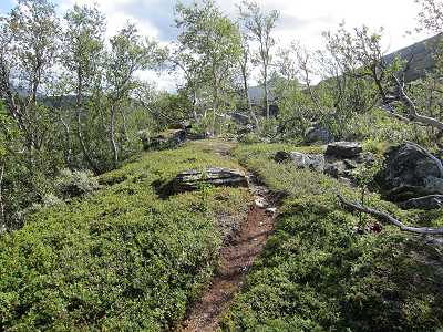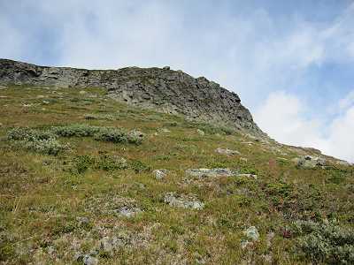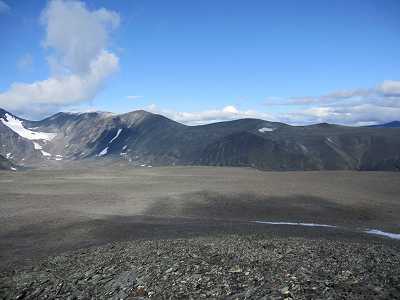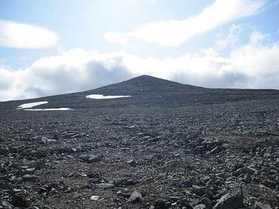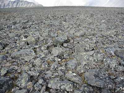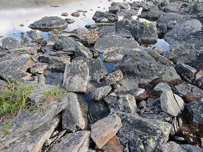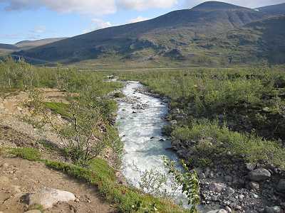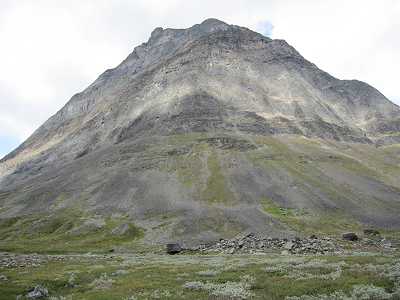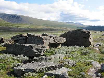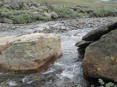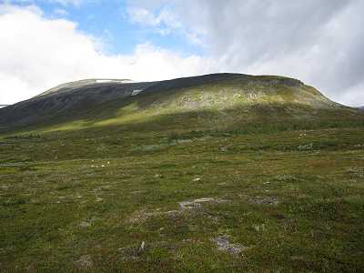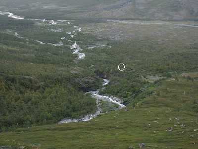 Dag 3: Fredag 14/8 2009 kl. 16:00Nu ligger jag nere vid Elsas bro och vilar i solen med en kopp te efter att ha varit upp i närheten av toppen mitt emot Laddjuvaggi.Det var tur jag gjorde denna tur för jag hade funderat på att tälta där uppe, men det var inte tältvänligt. Från Elsas bro följde jag på en upptrampad stig nedströms utefter Laddjujohka. Jag gick kanske 2 km förbi en hel del stora stenblock till en öppen hed. Där tog jag av mot berget och gick delvis lite tillbaka. Sedan blev det mycket brant uppåt, så det hade varit tungt med hela utrustningen. |