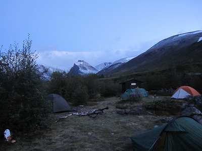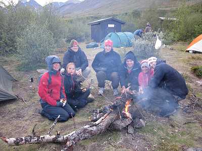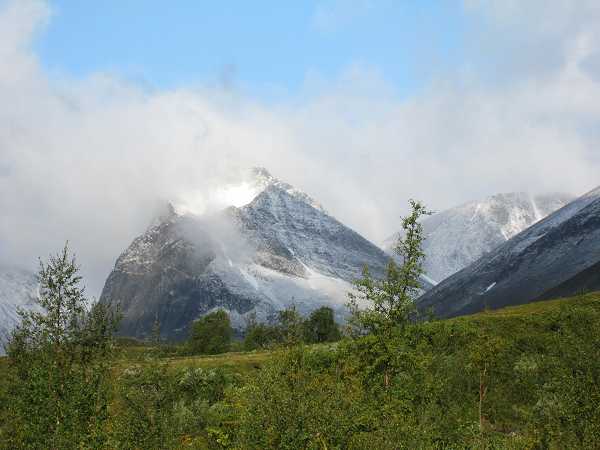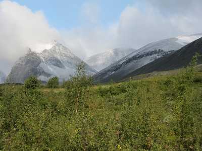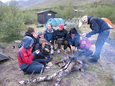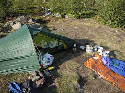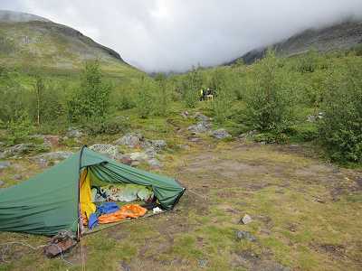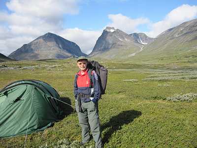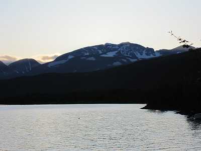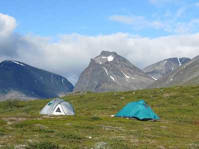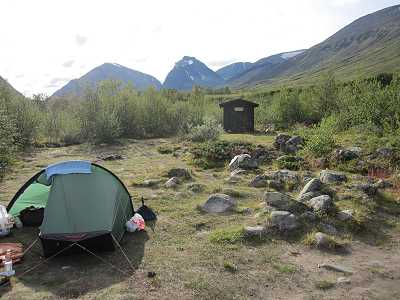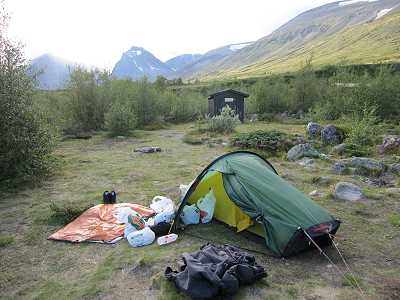 Dag 8: Onsdag 19/8 2009 kl. 09:00I natt var det verkligen kallt och det kom nysnö runt om på många toppar. Jag tror att vädret växlade mellan klart samt moln med regn och snö på topparna.I förrgår kom ett gäng ungdomar från Lund och tältade runt om mig, så jag fick lite pratsällskap. I går kväll gjorde de en brasa och grillade korv till middag och sedan satt vi och pratade ett bra tag. Det dök även upp ett par till, där killen hade cyklat ändå från Småland och tjejen från Sollefteå. Det var inte dåligt alls. Nackdelen med att sitta ute så länge på kvällen var att bli nerkyld trots brasan. |