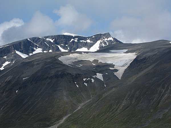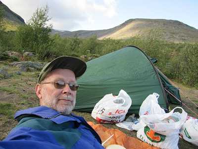 Jag kom sedan fram hit före kl. 15 och åt en våffla med grädde och kaffe. Senare har jag satt upp tältet och lagat middag på torkad lövbiff och potatismos, så jag är rejält mätt i kväll. Jag har även köpt en öl som mättar bra, så jag borde inte känna mg hungrig som i går. Dessutom har jag c:a 10 färdigbredda hårda dubbelmackor med kaviar, som jag kan äta i kväll samt till frukost i morgon. Nu ska jag vänta in solnedgången och se om det blir fotovänligt. Molnen försvann nyss från toppen av Kebnekaise, men det är svårt att fota då solen är där bakom och det blir bara en ljusrand i kameran. |