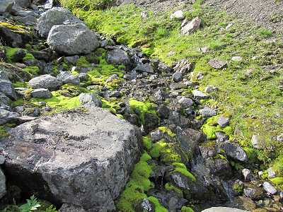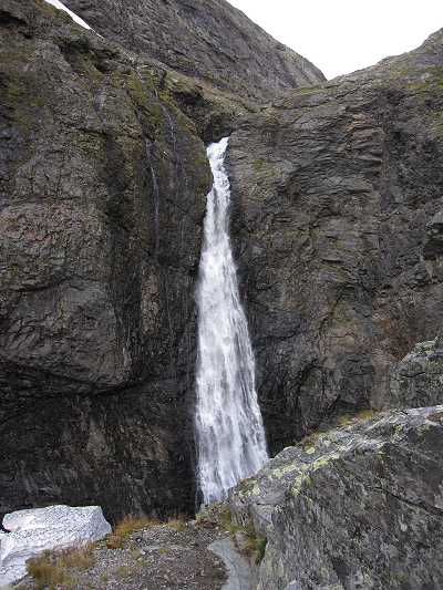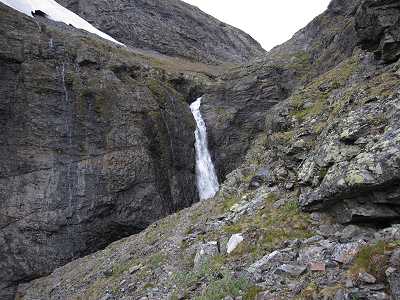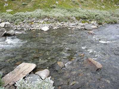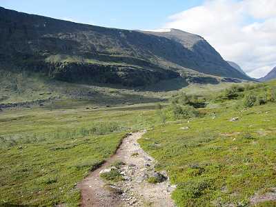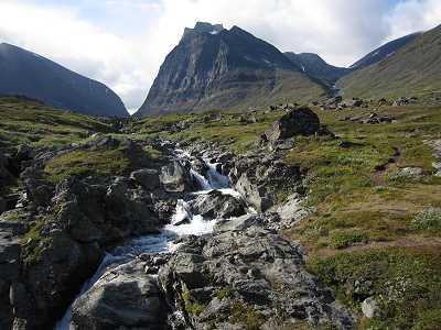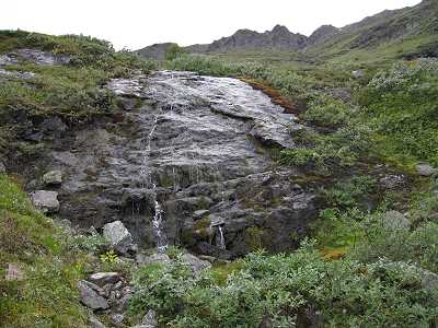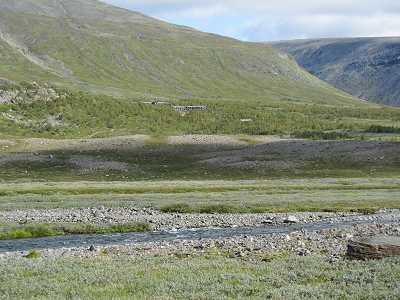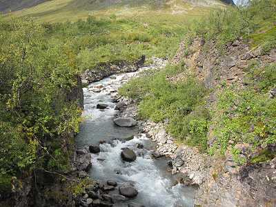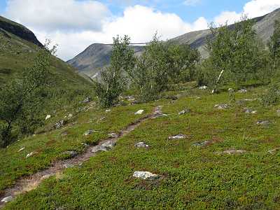 Dag 6: Måndag 17/8 2009 kl. 18:30I dag blev den bästa dagen hittills. Men gårdagen avslutades häftigt med 9.58 på 100 meter av Usain Bolt i Berlin.I morse var vädret först lite dåligt men förbättrades, så att jag åt en rejäl frukost och packade sedan ryggsäcken för att vandra mot Singi. Jag tänkte ta mig mot Silverfallet hitom Singivagge. Jag följde först leden mot Singistugorna och gick sedan mot Singitjåkkas östra sida. Jag fick göra en något besvärlig korsning av jokken från Singivagge, men det gick bra. Jag gick en bit nära Singitjåkka, men vände då det blev för brant. I stället gick jag tillbaka över jokken igen. Denna gång hade jag mina 3 dm höga coverboots, som man drar över kängorna och upp mot knäna. |