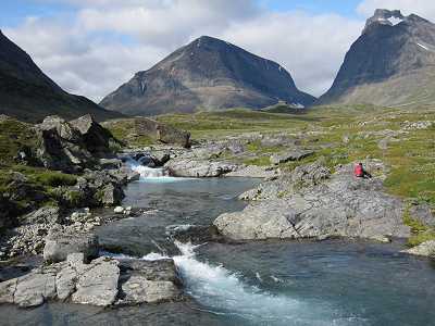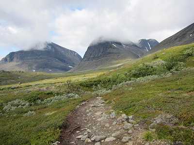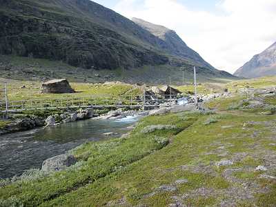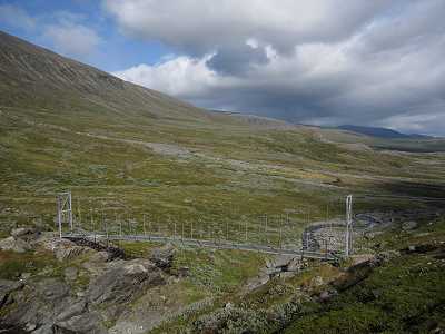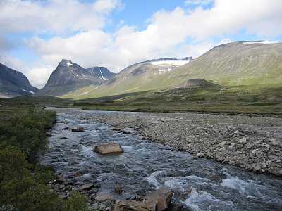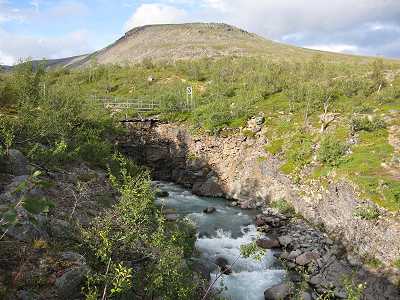 Molnen kom och gick över toppen på Kebnekaise, så det gällde att ha tur med molnen för de som gick up idag. Jag hade termos med te och mackor, som jag åt. Sedan kom det lite mörka moln, så jag gick tillbaka. Denna gång mycket högre upp i dalgången under bergsbranten. Men det var också rätt jobbigt. Efter 1,5 timmar var jag nere här vid bron och nu har vädret blivit bättre igen, så det är varmt i solen. |