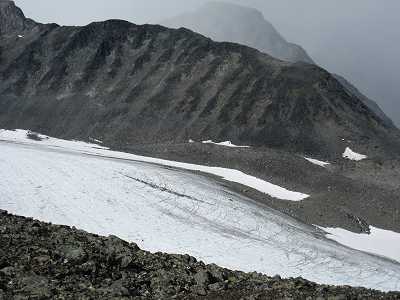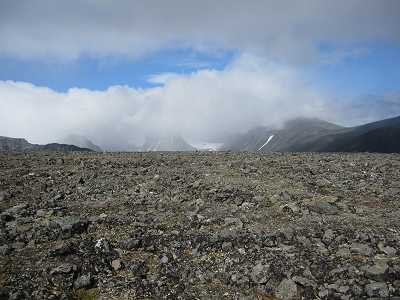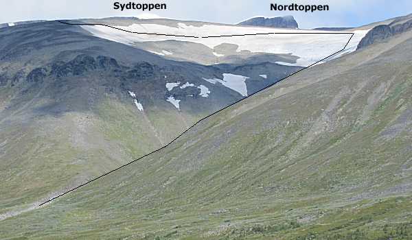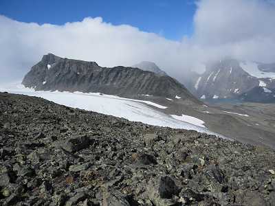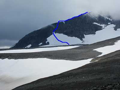 ![]() Östra leden går du med ledare uppför dalgången mot glaciären där uppe. Därefter mot vänster över glaciären och fram till en brant klippvägg. Där klättrar du nästan rakt upp och är sedan nästan framme vid toppstugan. |