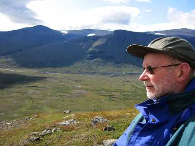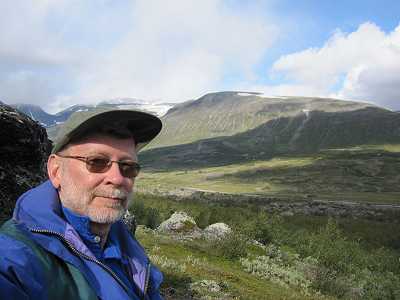 Dag 7: Tisdag 18/8 2009 kl. 18:30I dag blev det också en mycket bra dag. I morse var vädret lite osäkert, men jag beslöt att efter frukosten ge mig av på en tur.Jag kom iväg vid 10-tiden och gick rakt upp mot branten väster om leden till Tarfala i utkanten av Kebnetjåkka. När jag kom upp på platån var det bara stenskravel. Jag fortsatte några km i riktning mot Tarfala. Det var lite jobbigt att gå på stenarna, men efter någon timme fick jag lön för mödan. Det var slut på platån och i stället tvärbrant ner mot Tarfala och en fin utsikt både ner mot dalen samt runt om mot alla fjäll. Det var halvklart väder men mycket kyligt och det föll även lite snöflingor. |
