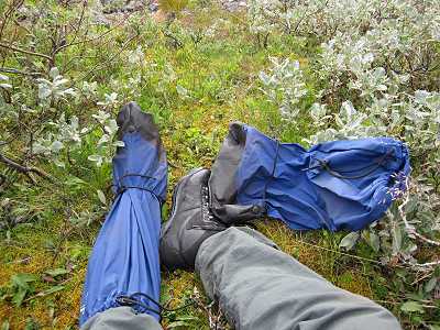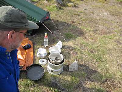 Sedan gick jag tillbaka till tältet vid 15-tiden. Solen sken och jag tänkte fika ute men plötsligt kom ett mörkt moln från öster och jag hann precis in i tältet med en kopp choklad innan regnet kom och höll i sig någon timme. Jag hörde flera vandrare som var ute och även blev blöta. Vid 18-tiden blev det uppehåll, så jag kunde hämta vatten och laga middag på köttfärssås och makaroner, som jag blandade ihop med en varma koppen på kantarellsoppa. Det blev riktigt gott. Nu är det lite småregnigt, så bäst att vara inne i tältet med en kopp te och VM i friidrott på P4 på radion. |