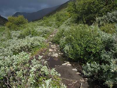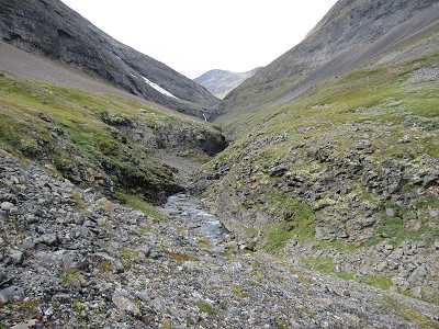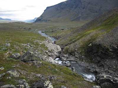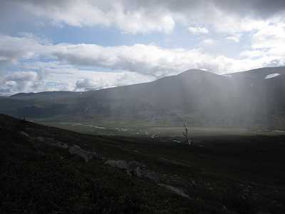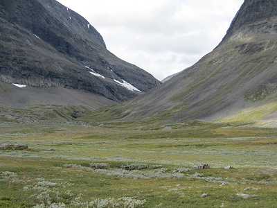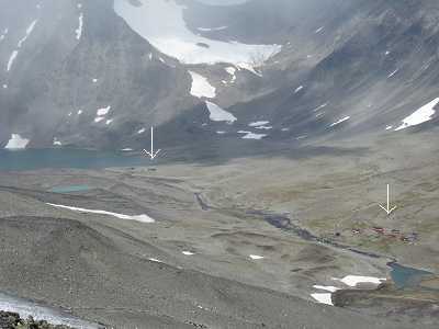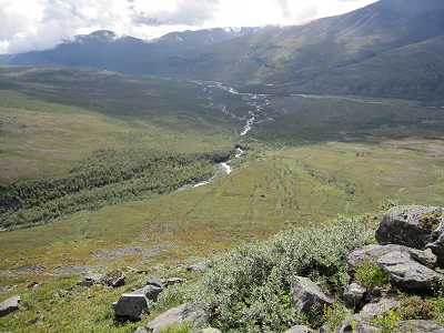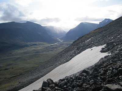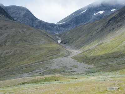 Dag 5: Söndag 16/8 2009 kl. 20:00I dag har det verkligen varit växlande väder men mest regn. Vid 12-tiden sken solen så jag åt ordentligt med havregrynsgröt och gick sedan iväg med en lätt packning uppför dalen mot Tarfala.Det var fint här nere vid Laddjuvaggi men upp mot Tarfala var det rätt mörkt. Efter en km mötte jag två män som kom från Tarfala och bara haft regn. Jag tog på regnställ och skydd för ryggsäcken och gick en bit till, men beslöt sedan att vända om fast att gå uppför östra dalgången. |