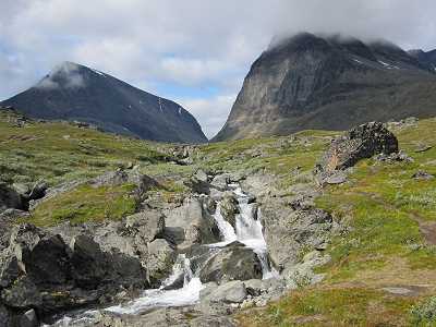 Dag 4: Lördag 15/8 2009 kl. 12:00Idag är det vilodag, så jag tar det lugnt i tältet och kanske går till fjällstationen en stund senare.Igår var jag framme vid tältet strax efter kl. 17 och man kände sig rätt mör i kroppen. Så småningom lagade jag middag på Blå Bands höns med ris och curry. Den var väl kryddad och smakade mycket bra. Det var inga problem att äta 1-2 portioner. För 2 personer får man nog öka på med ris, mos eller pasta. Efteråt drack jag en kopp kaffe med lite Jägermeister i. Man kunde se bortåt Tuolpagorni och Kebnekaise att regnväder kom och gick blandat med solsken. Jag klarade mig undan regent här vid forsen upp mot Tarfalla. |