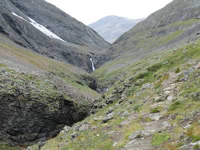 Det var en häftig syn med ett fall på 20-30 meter och branta stup på var sin sida. 1991 gick jag och sonen i ösregn från Singivagge och ovanför Silverfallets östra sida under Tuolpagorni. Hur det kunde vara möjligt begriper jag inte, när jag nu kunde se hur brant det är. Jag kunde idag inte se att det var möjligt med den vandringen. Det kändes rätt mycket rädsla i kroppen, när man tänkte tillbaka på det. Vädret hade nu blivit rätt stabilt och jag vände om på stigen och följde den tillbaka. Den kom så småningom in på den stora leden mot Singistugorna, men var då knappt någon stig längre utan bara enstaka stenrösen. Därför hade jag inte upptäckt den på vandringen mot Singi. Jag kom tillbaka till fjällstationen vid 16-tiden och handlade lite bullar och godis. Jag har nu ätit middag och kan ta det lugnt och ska se om jag får in P4-lyssnandet. |