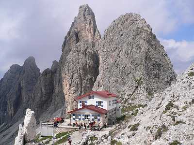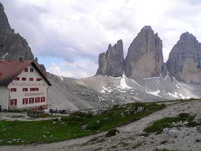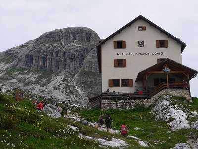 Dag 3: Söndag 12/7 2009Vi vaknade upp till bedårande ögonfröjd med morgonsol över Einser Cima Uno. En topp på 2.699 m.Efter frukost samlade vår ledare, Maria Bylin, oss till "morgonandakt" Hon berättade om dagens vandring och lite historik om bergen. Avslutningsvis citerade hon en dikt som passade väl in på vad vi höll på med. Vi gick till Zsigmondy Comici-hytte på 2.235 m. där vi skulle övernatta. Sträckan var ca 5 km och med en sträckhöjning på 700 m. Det tog 2 timmar. Det var en väldigt ansträngande led, för det var bara konstant uppför. Leden var mest mindre grusväg, annars mycket grus och stenar. |