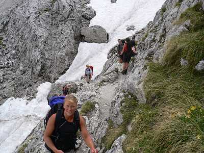 Sen började vi en brant stigning, ändå bara 450 m., men det var väldigt ansträngande. Vi gick även uppför genom ett snöfält. Sista biten innan stugan fick vi ta hjälp av vajrar. Det var en häftig upplevelse. Vi nådde övernattningsstugan Fonda Savio 2.367 m. Nu fick vi många goa skratt. Vi fick ligga på loftet - annexet. Först vanlig trappa. Sen uppför en stege med vindshål där ryggsäcken knappt gick igenom. Väl vid sängarna - två rum med 15 bäddar sammanlagt. Ingen taklampa, bara dagsljuset från två fönster. Ståhöjden var 1,40. En av våra sängar stod på tre ben. Det fjärde bundet i ett rep i taket. |