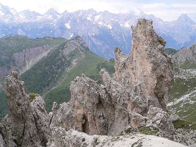 Dag 6: Onsdag 15/7 2009Dagens vandring var helt annorlunda mot innan. Höjdskillnaden var i stort sett det samma, men vi rörde oss ca 400 m upp och ner. Det var heller inte konditionskrävande, utan mycket mentalt.Det var vajer, stege och träbro. Riktig salamanderklättrning på händer och fötter, både fram och baklänges. Leden var stenig och lösgrus, så det till att hålla ihop gruppen och lita på framförvarande. Vi gick över fyra pass. Här kunde man även se de andra bergsgrupperna i Dolomiterna. |