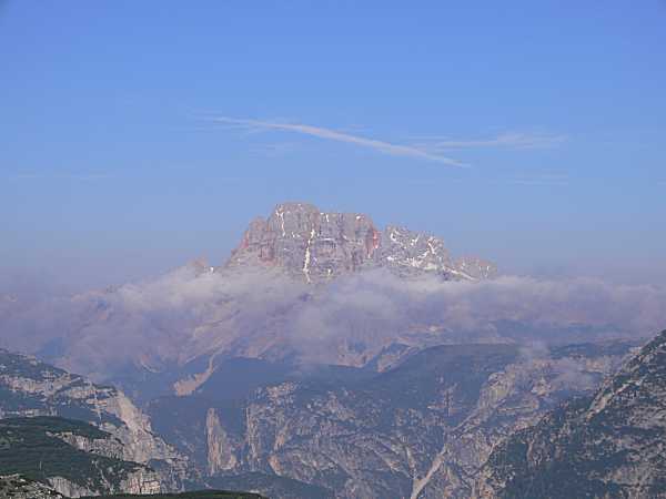 Dag 5: Tisdag 14/7 2009Vi gick till Rifugio Auronzo 2.333 m. Vägen dit gick precis i närheten av Drei Zinnen. När vi var riktigt nära, såg vi klättrare på den mittersta toppen. Leden bestod av mest grusväg. Till och med bred nog för bilväg. Vi köpte mackor, både som vi åt på plats och som vi tog med som färdkost. Toaletten på denna stuga bestod av kaklat hål i golvet….bara att böja rejält på knäna.När vi var på toppen avpassset berättade Maria att vi nu lämnar Sexten-gruppen för att gå in i Cadini-gruppens mycket spetsigare toppar. Här finns Dolomiternas näst högsta topp, Antelao, 3.264 m. Den högsta, Marmolada, 3.342, kunde vi inte se. På grusvägen kom vi in i tjock dimma, men den lättade när vi lämnade stugan och började gå neråt. |