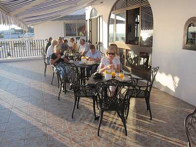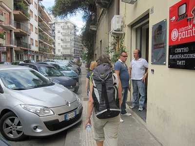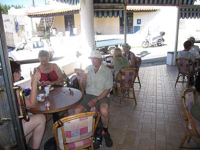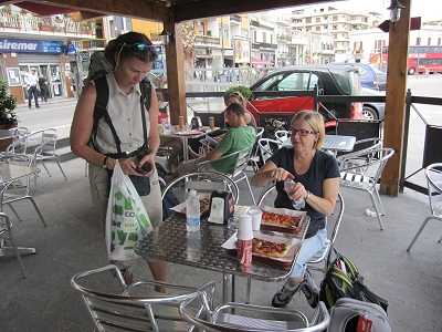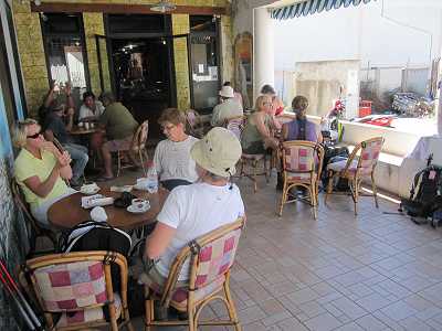 Vulkanen Stromboli sträcker sig nästan en kilometer upp, så det kommer att bli en jobbig tur upp till toppen. Vi fick skjuts med våra resväskor till hotellet medan vi gick någon kilometer genom byn till vårt hotell Villagio. Sedan fick vi dagen fri till kl. 16 då vi ska gå en bit upp på Stromboli. Vi gick tillbaka en bit genom byn till en restaurang, här vi nu sitter och fikar. |