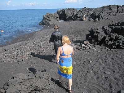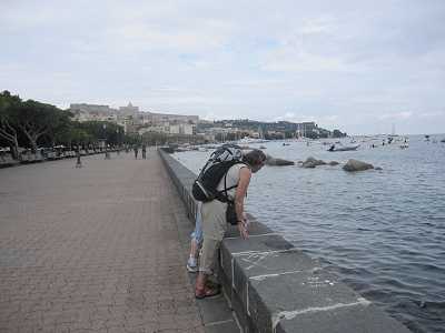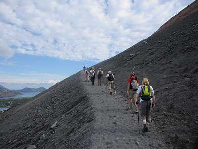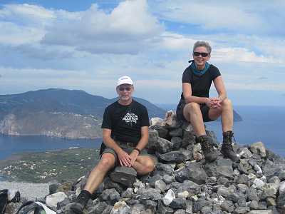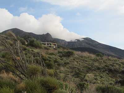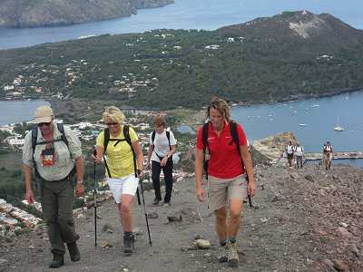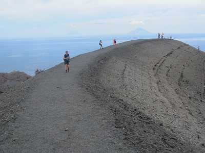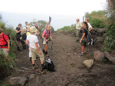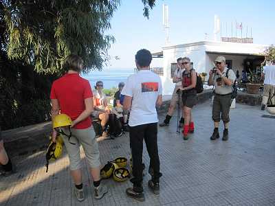 Dag 5: Lördag 2/10 2010 kl. 15:00 Vi kom iväg igår vid 4-tiden på eftermiddagen. Före det hade jag hunnit med att tvätta lite kläder med Y3. Man svettas ner kläder hela tiden, så det är bra att kunna tvätta. På detta hotell fanns även linor att hänga upp kläder och t.o.m. några klädnypor. Hotellet är annorlunda byggt som en liten tät by med språng och små gränder och uteplatser lite här och där och från en del var det härlig utsikt mot havet. Vandringen gick på en stig som under några timmar tog oss allt högre upp på Strombolis slutning. Till slut var vi uppe 450 m.ö.h. Längre upp än så fick man inte gå utan licensierad guide. Nu hade vi Georgia som guide upp till denna plats, men där var det stopp. Vi kunde se några hundra meter högre upp hur det pyste från underjorden men det var enbart rök och ingen eld. Det var troligen för ljust för att kunna se något ledfyrvarkeri. Men med jämna mellanrum c:a 20 minuter mullrade det från vulkanen. Vi gick sedan neråt igen en annan väg förbi en restaurang varifrån folk kunde sitta och titta på vulkanen. Om dom inväntade mörkret kunde dom säkert se fyrverkeriet. |