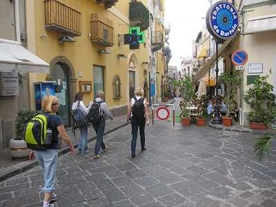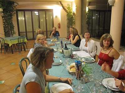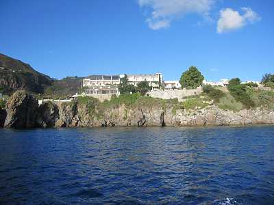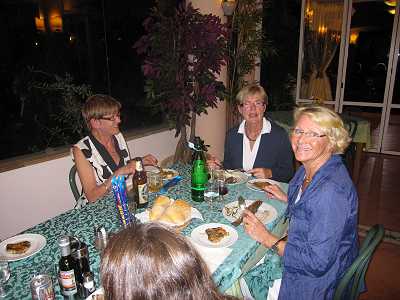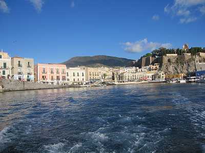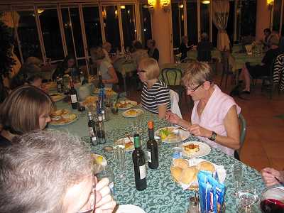 En dryg timme senare var vi framme i Lipari. Här kom en person från hotellet, där vi skulle bo och hämtade våra väskor medan vi själva promenerade genom Lipari. Det var en mycket trevlig stad med många affärer och större än vad jag hade trott. Vi gick utefter huvudgatan med bl.a. en supermarket. Så småningom kom vi fram till vårt hotell och fick våra rumsnycklar och kunde packa upp våra väskor. Det är ett mycket fint hotell Giordino sul mare på en klippa nära havet med underbar utsikt från balkongen. Strax untanför finns en stor pool med tyvärr för stor salthalt i vattnet, så man måste komma ihåg att duscha med sötvatten efteråt. Från bassängen kunde man även gå via trappor ner till havsvattnet och ta ett dopp. Lite senare var vi ett gäng, som gick ut på stan för att bekanta oss och även för att köpa vatten. Man kan inte dricka vattnet i kranarna utan man köper allt dricksvatten. När vi kom tillbaka till hotellet var vi några som provade poolen och simmade lite samt beundrade utsikten. Kl. 20 var middagen serverad. Vi åt en god 3-rätters middag med ett glas vin därtill. Stämningen blev hög och det kändes spännande att få börja med vulkanvandringen. Framåt kl. 22 var middagen slut och dags att sova efter en lång dag. |